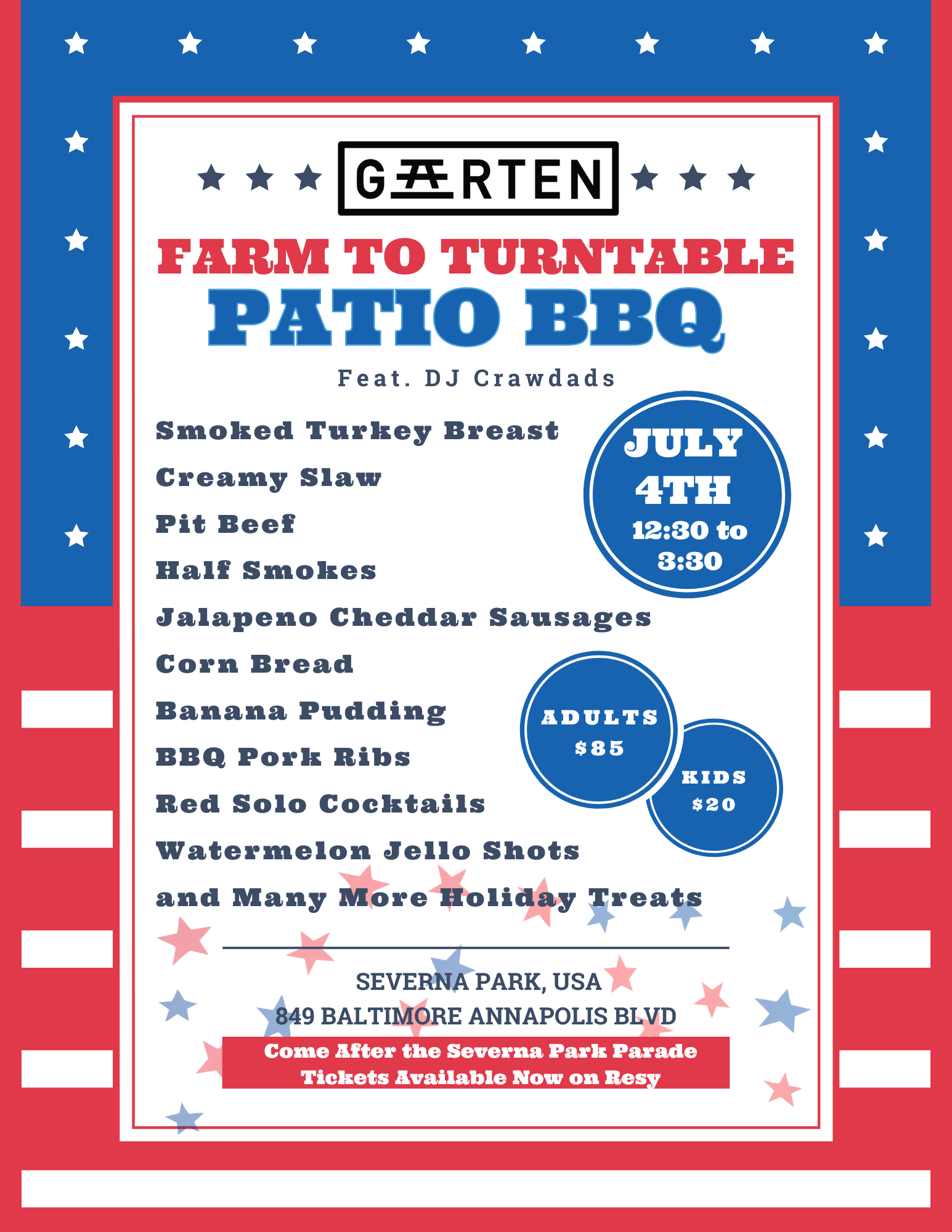Join us after the Severna Park 4th of July Parade for the ultimate patio BBQ party with live vinyl tunes and ALL the fixins! Tickets are available now and will go fast, so scope out the menu below and click to book now.